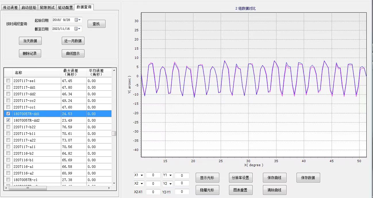 對輸入軸提供任意的旋轉角度,測試輸出軸理論上旋轉角度和實際旋轉角度的差。測試時,同步采集輸入端和輸出端角度變化量,然后根據減速比,計算理論上旋轉角度和實際旋轉角度的差即為角度傳達誤差。